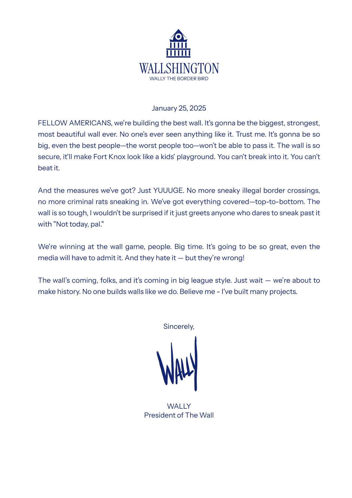 The time is NOW, my friends. The time to secure borders, build greatness, and do it with more swagger than a Hollywood blockbuster. This is the Wally and The Wall™ Project. It's not just any wall, it's THE WALL. We're talking legendary stuff here. A wall like you’ve never seen before. Think about the Great Wall of China, but with more spirit, more fun, and way more Wally.